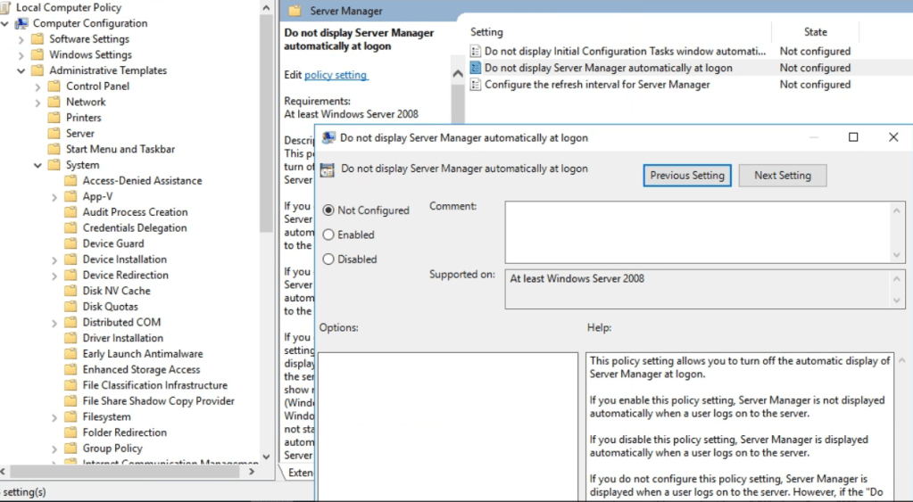 First bring up group policy editor and create a GP and navigate to Computer configuration, Administrative Templates, System, Server Manger and then open ” Do Not Display Server Manger Automatically at logon” and click enable.